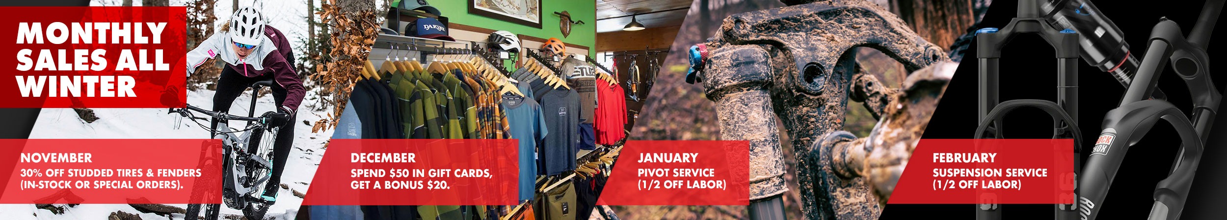 Don't get stuck in the spring service queue. The off-season is the best time to give your ride the professional care it deserves, ensuring you're ready for the first sunny day when spring rolls around. We're offering a special each month to get your bike and your gear dialed for your next ride.